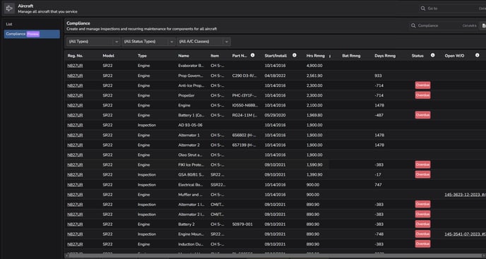Compliance in aviation is essential for ensuring adherence to the protocols and regulations established by aerospace regulatory authorities. Aircraft operators are not only required to abide by these safety standards and directives, they must provide proof through documentation. The Compliance module offers robust functionality for tracking maintenance requirements and events, whether they occur as a one-time necessity or recur at specified intervals.