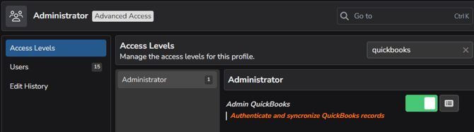 - Under the Access Levels tab, type "quickbooks" into the Search Bar. This will narrow down the permission settings displayed.
